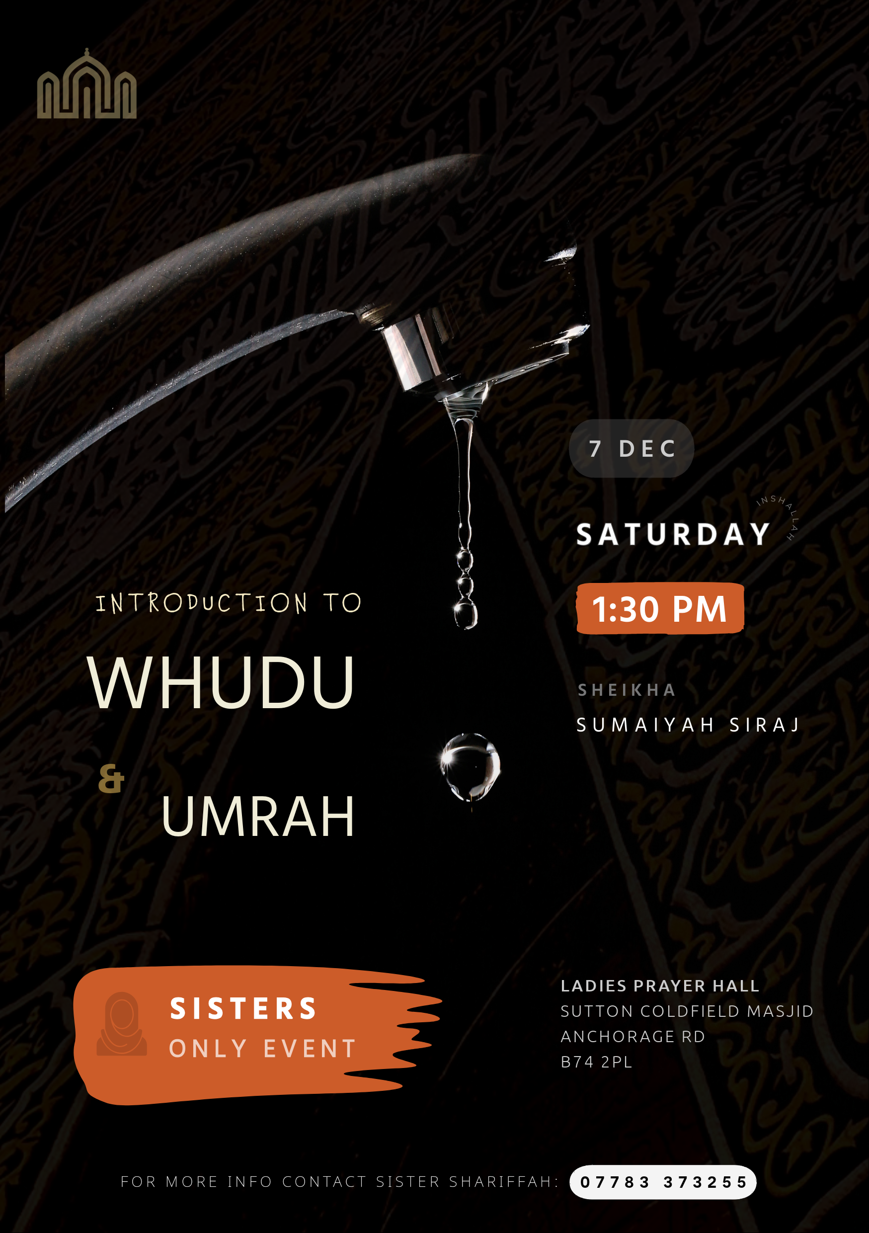Please remember to bring your own prayer mat, a shoe bag, and attend in a state of Wudhu.
